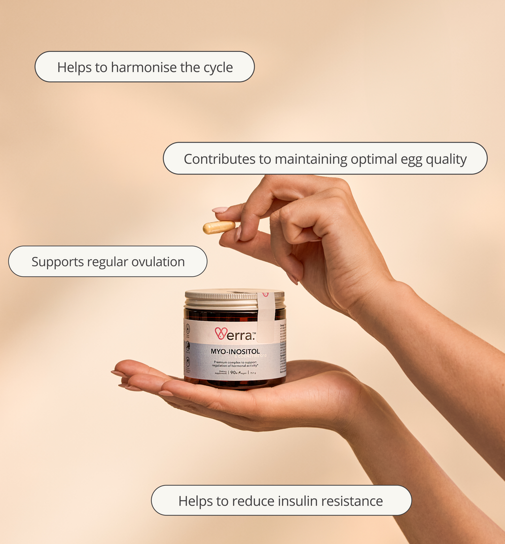 The product contains myo-inositol, coenzyme Q10, vitamin B6, and folic acid. These are substances that naturally occur in the body or are commonly taken as supplements. However, the product was not specifically developed for pregnant women—in this case we recommend our Fertility & Pregnancy complex, which is formulated directly for the needs of pregnant women. In general, the needs of pregnant women can vary significantly, and the suitability of any dietary supplement should always be consulted with your physician or gynecologist, who knows your health condition and any current treatment.