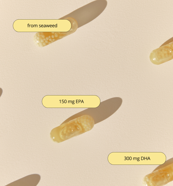 Složení ve 3 kapslích: olej z mořských řas (Schizochytrium), plnidlo: mikrokrystalická celulóza, hydroxypropylmethylcelulóza; obal kapsle (hydroxypropylmethylcelulóza), avokádový olej (Persea americana Miller), vitamin C (kyselina L-askorbová), zahušťovadlo: hydrogenovaný řepkový olej, vitamin E (D-α-tokoferyl-acetát), přírodní peprnomátová silice (Mentha piperita L.), přírodní peprnomátové aroma.